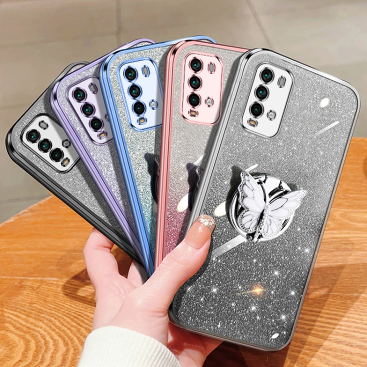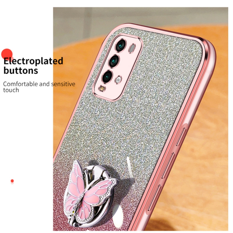 Para Redmi Note 9 4G Funda para Teléfono de TPU con Soporte de Mariposa con Brillo Degradado Plateado (Púrpura)