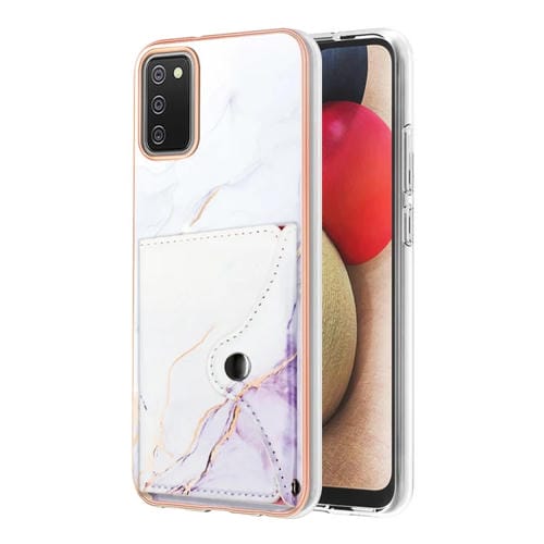 Estuche para Teléfono Samsung Galaxy A02S Versión UE con Ranura para Tarjeta y Patrón de Mármol (Blanco Púrpura)