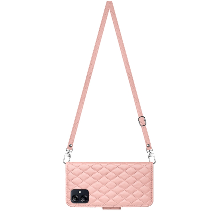 Funda de Cuero para Samsung Galaxy A04E con Tapa Textura Rómbica y Cordón Largo (Rosa Coral)