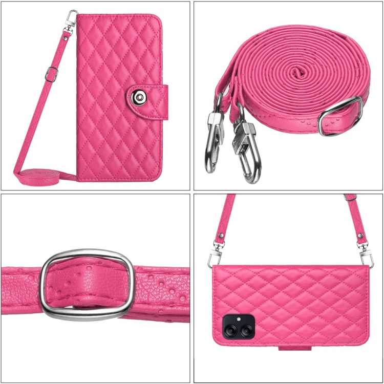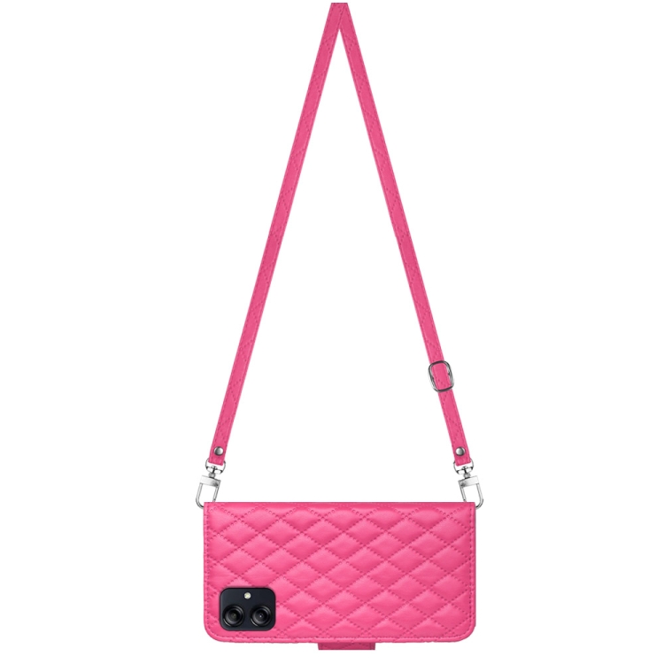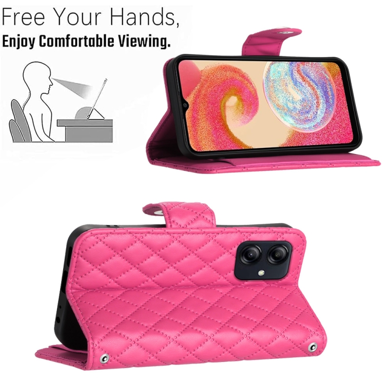 Funda para Teléfono Samsung Galaxy A04E con Tapa de Cuero Textura Rómbica y Cordón Largo (Rojo Rosa)