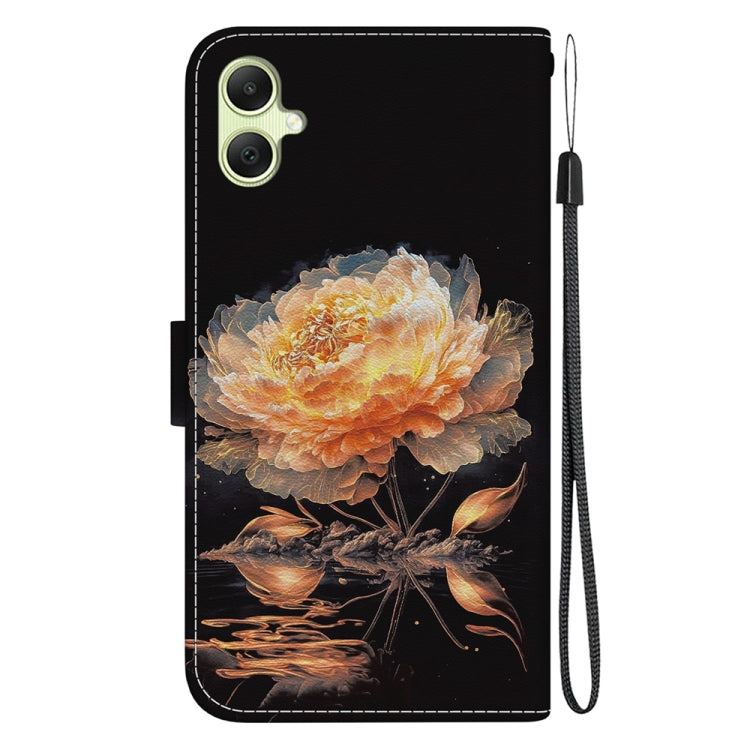 Estuche de Cuero Samsung Galaxy A05 con Dibujo Coloreado y Textura de Cristal (Peonía Dorada)