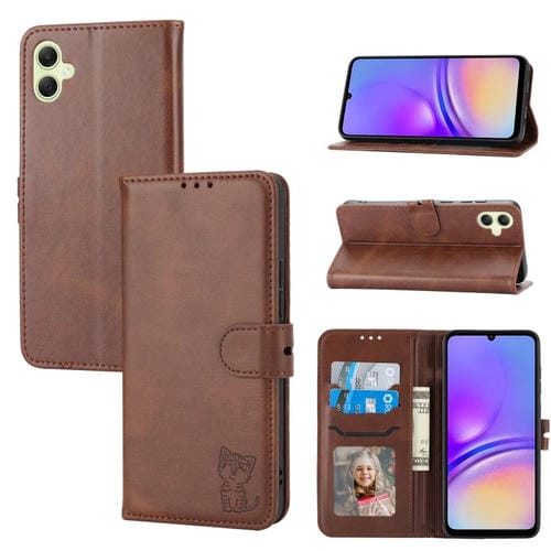 Funda para Teléfono Samsung Galaxy A05 Cuero con Tapa y Patrón de Gato Feliz en Relieve (Marrón)