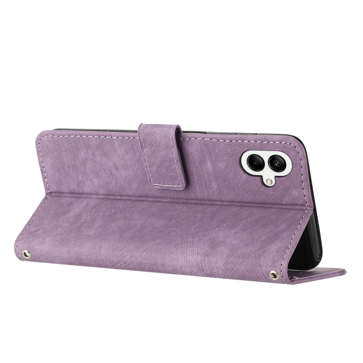 Funda de Cuero para Samsung Galaxy A05 Skin Feel con Patrón de Rayas y Cordón (Púrpura)