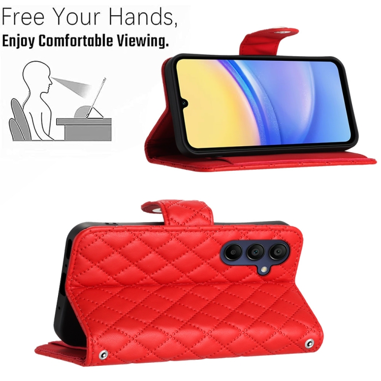 Funda de Cuero para Samsung Galaxy A05S con Tapa Textura Rómbica y Cordón Largo (Rojo)