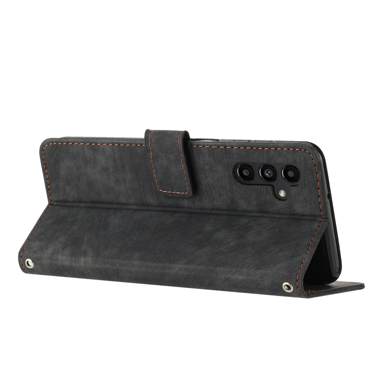 Funda de Cuero Samsung Galaxy A05S Skin Feel con Patrón de Rayas y Cordón (Negro)