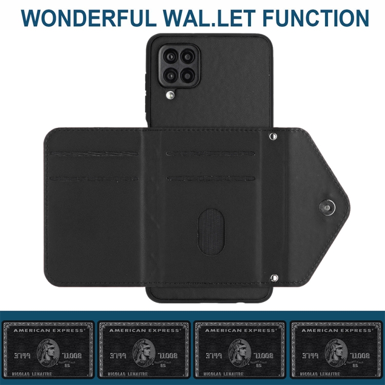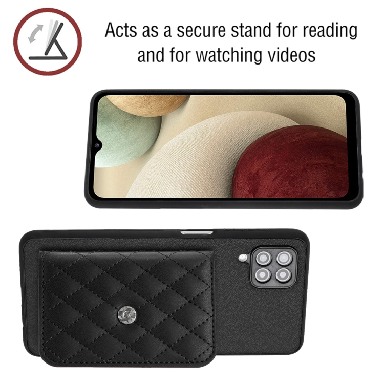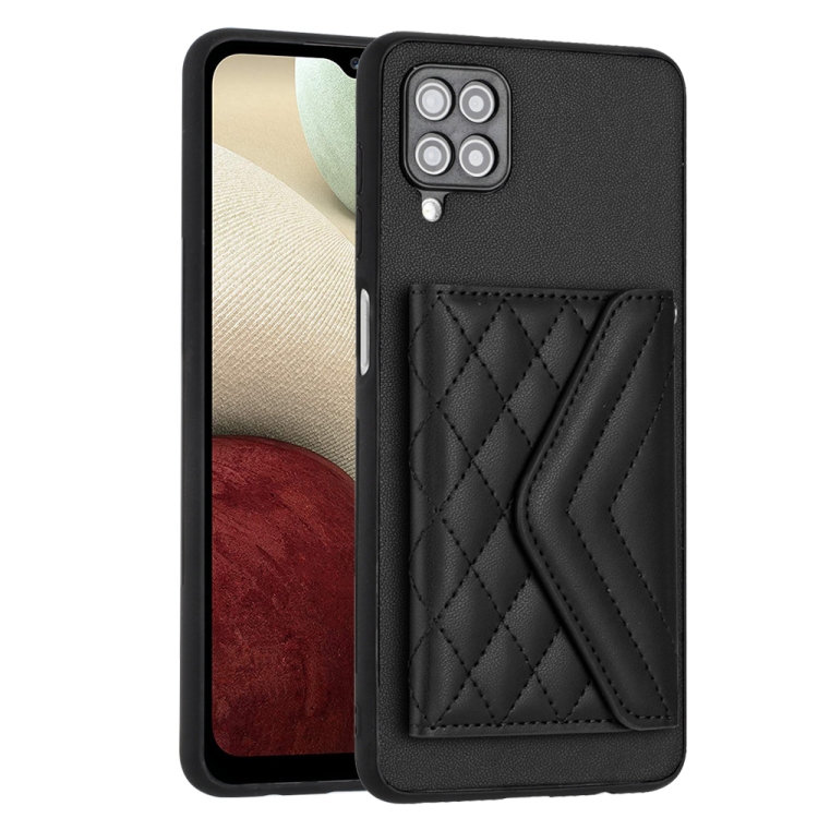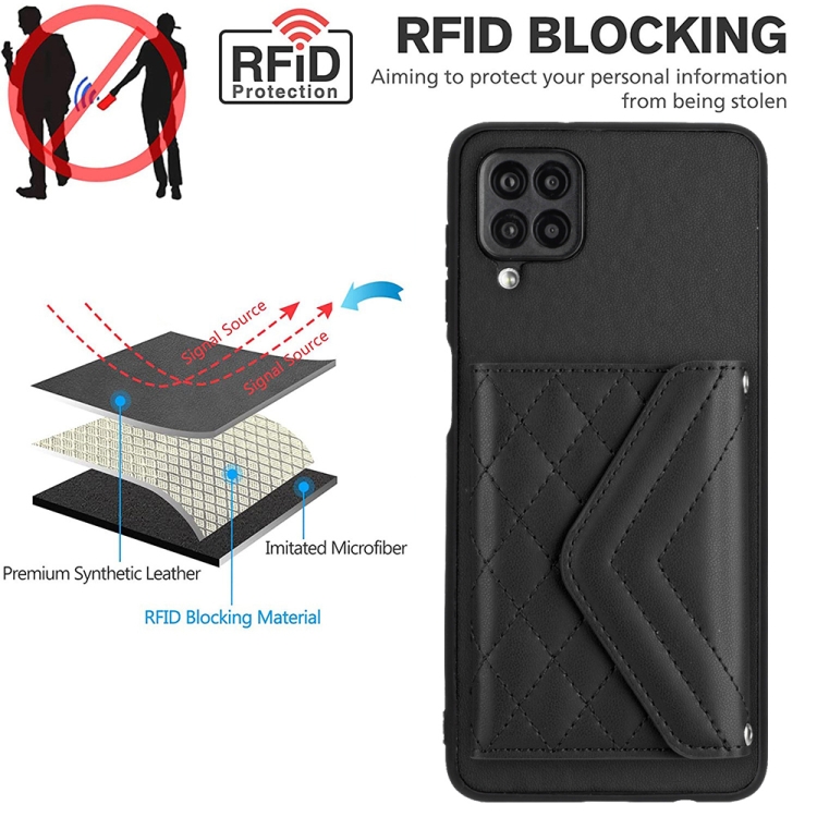 Estuche para Teléfono Samsung Galaxy A12 Rfid con Bolsa para Tarjetas Textura Rómbica y Cordón Largo (Negro)