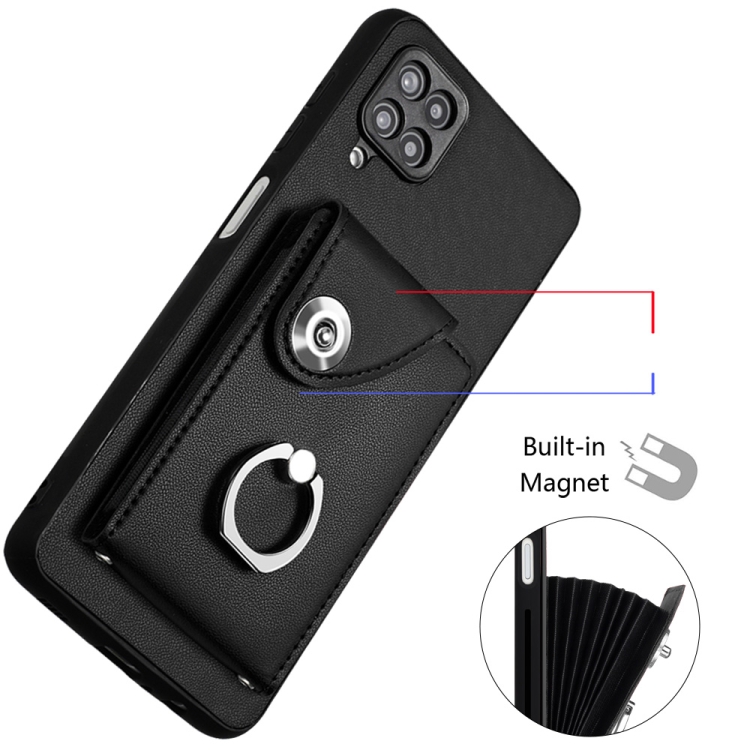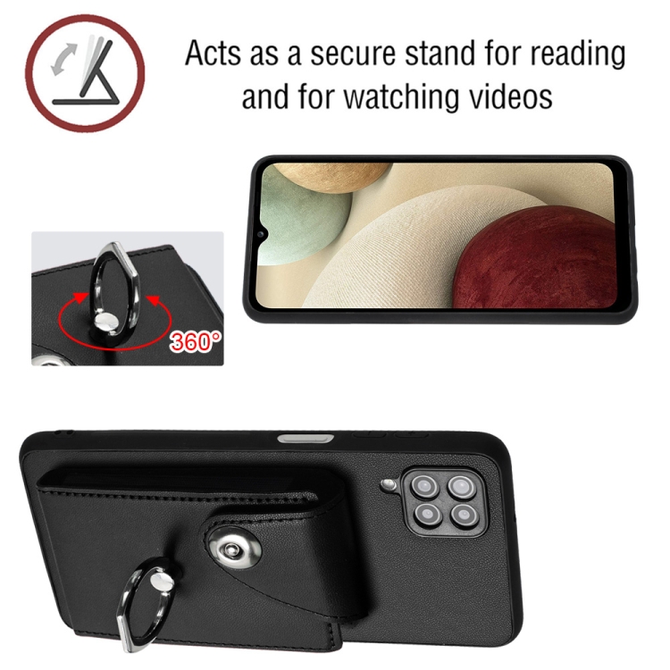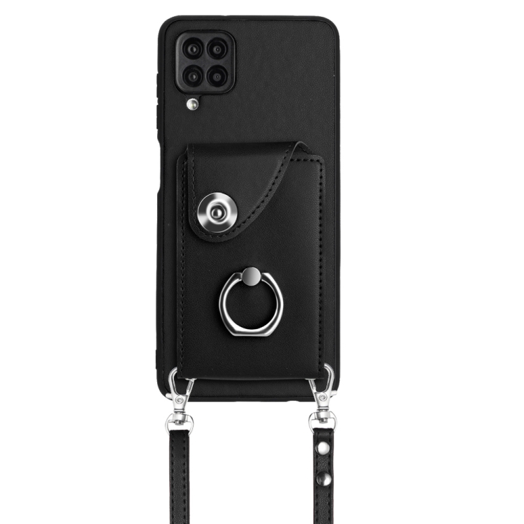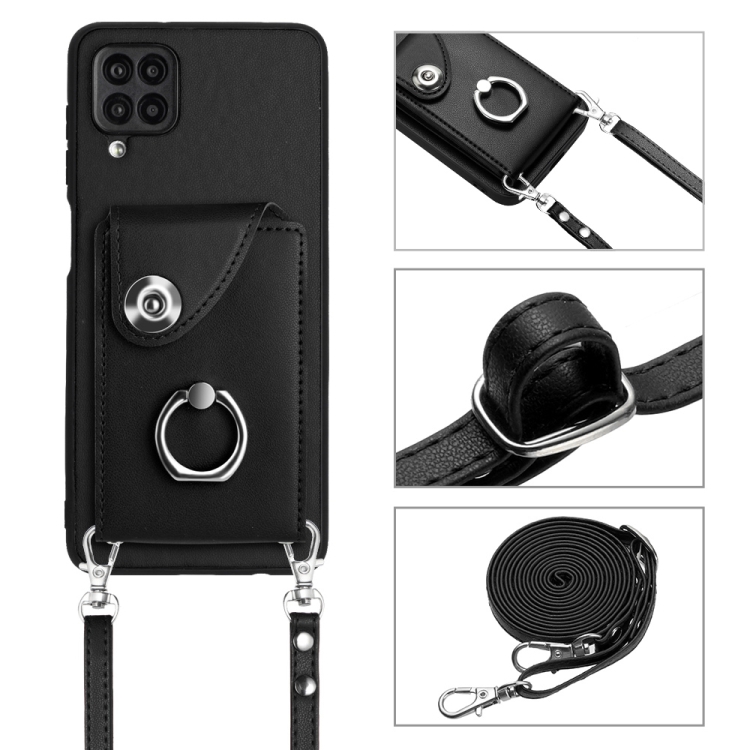Funda para Teléfono Samsung Galaxy A12 con Soporte para Anillo y Bolsa para Tarjeta con Cordón Largo (Negro)