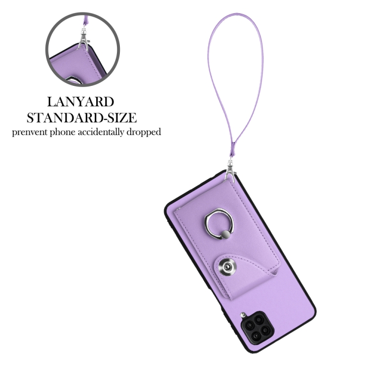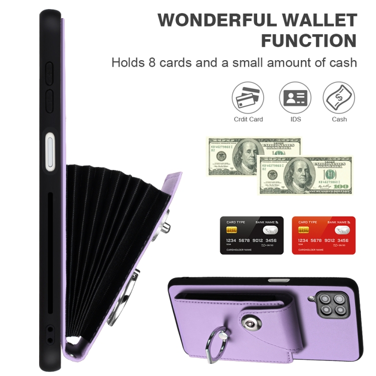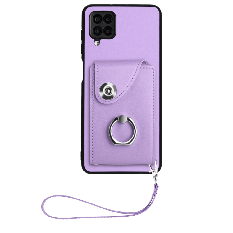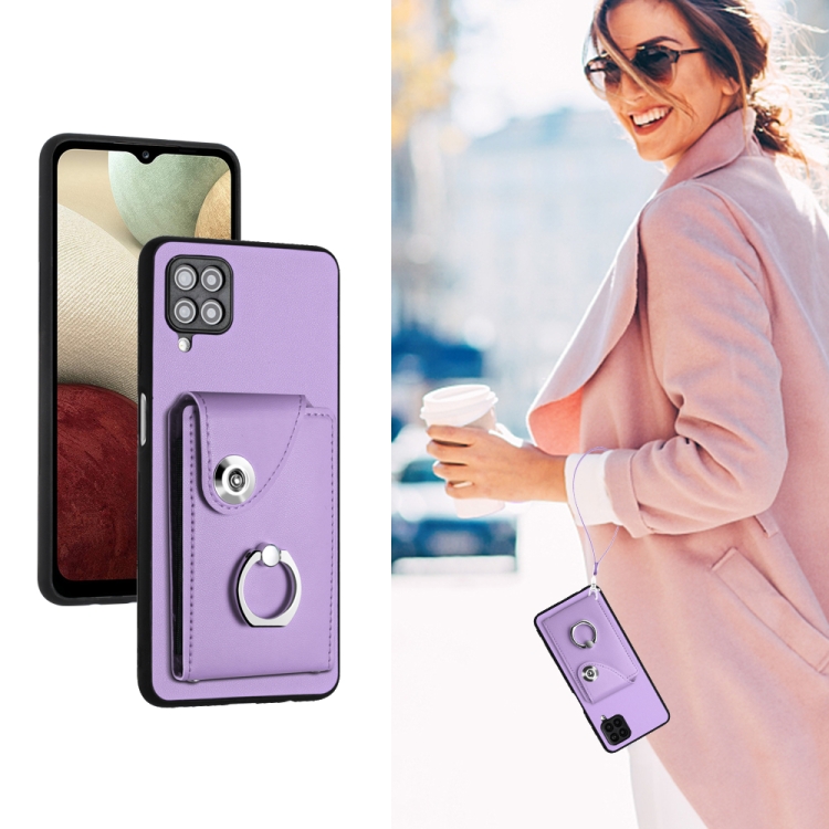 Funda para Teléfono Samsung Galaxy A12 de PU con Soporte para Anillo y Bolsa para Tarjeta con Cordón (Púrpura)