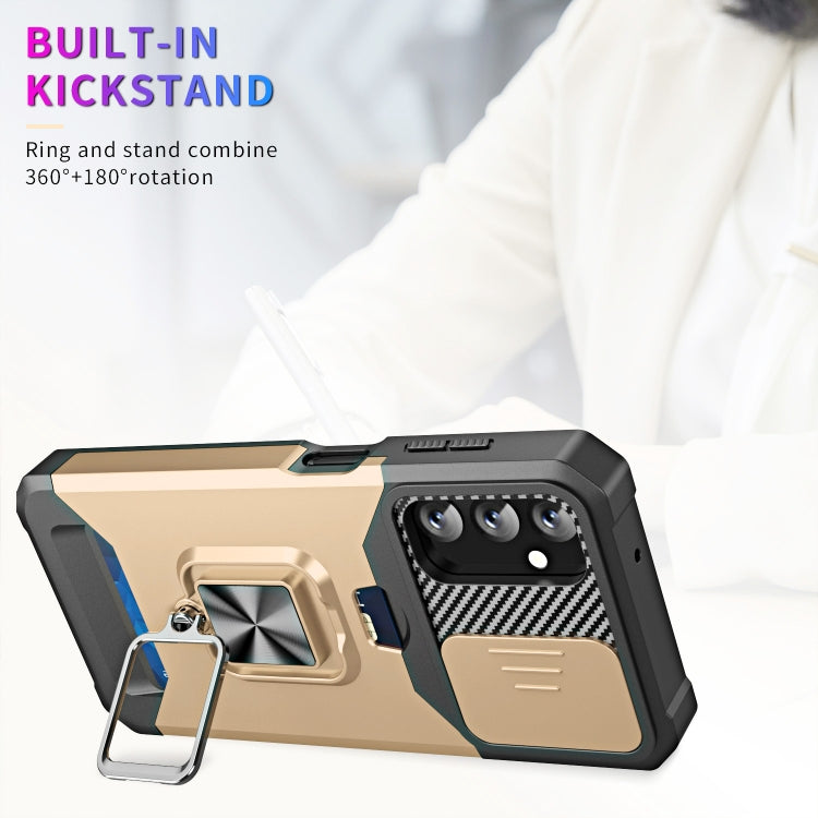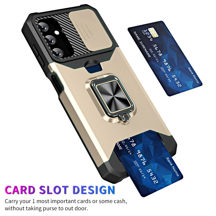 Estuche deslizante Samsung Galaxy A14 5G Camshield soporte anillo ranura tarjeta (Oro)