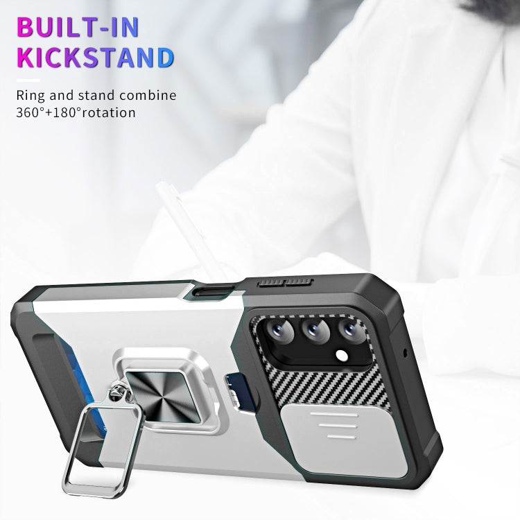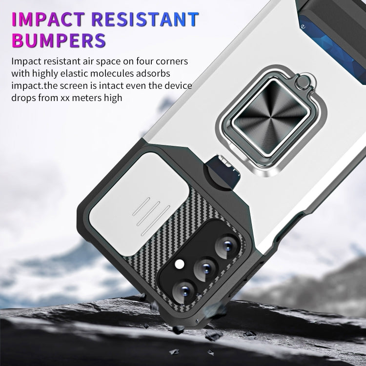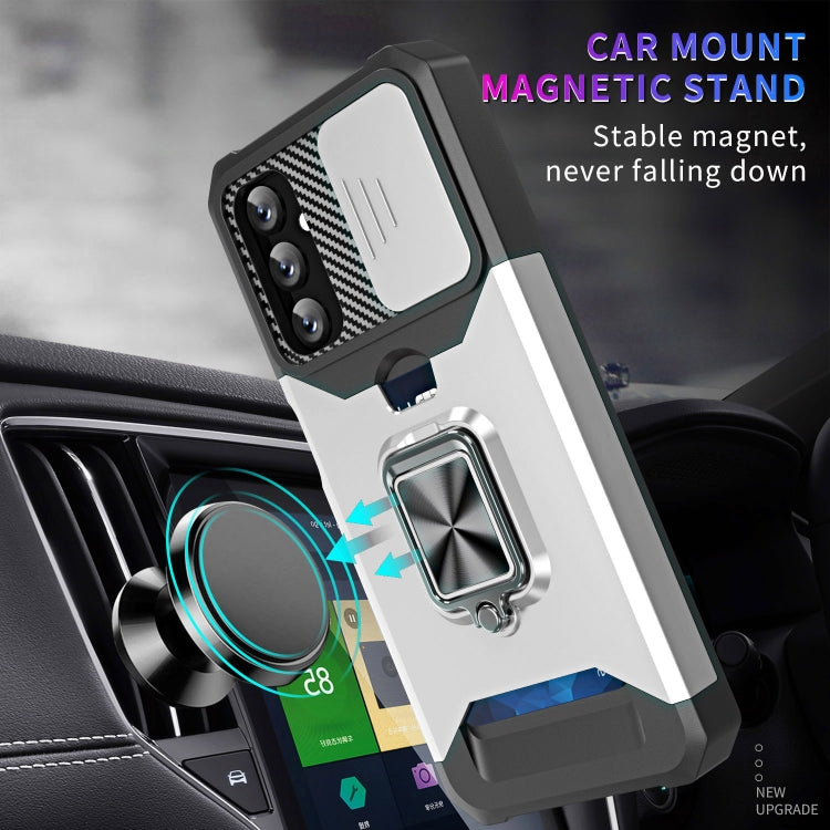 Estuche Deslizante Samsung Galaxy A14 5G Camshield con Soporte y Ranura para Tarjeta (Plata)