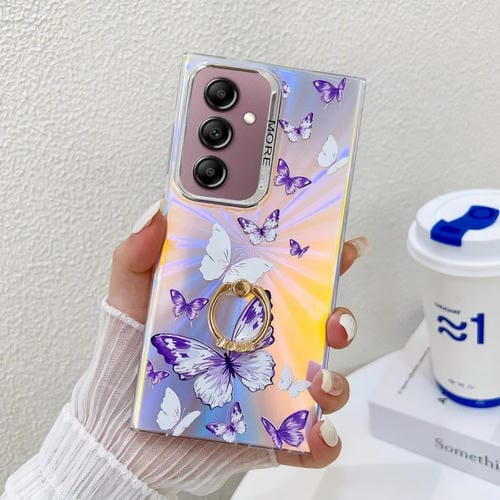 Estuche para teléfono Samsung Galaxy A14 5G con soporte para anillo de mariposa láser con galvanoplastia (Mariposas Moradas Blancas)