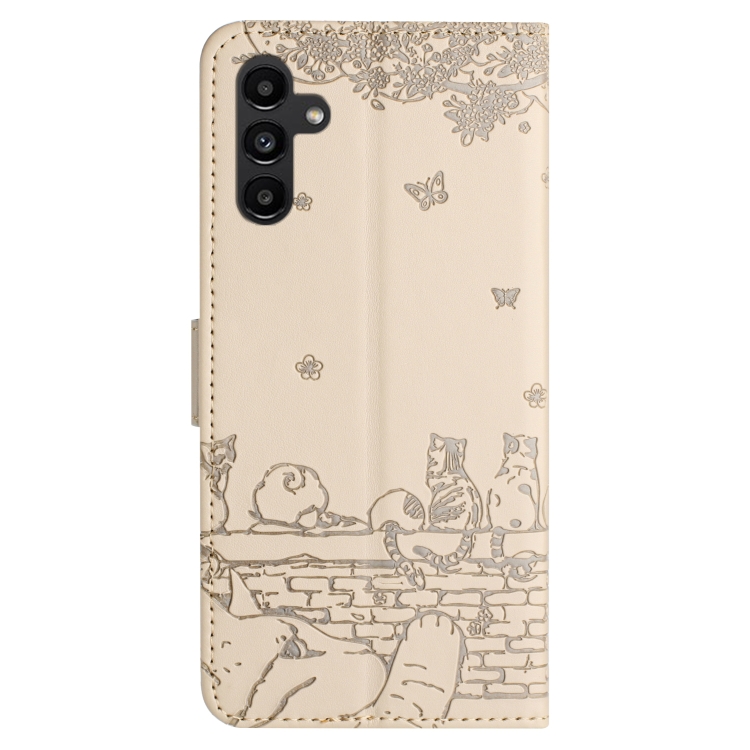 Funda de Cuero Samsung Galaxy A15 Estampado de Gato con Cordón (Beige)