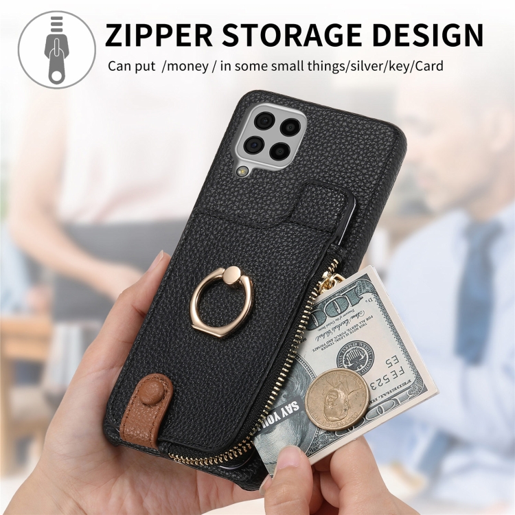 Funda para Samsung Galaxy A22 4G Litchi Leather Oil Edge Ring Zipper Wallet Back (Negro)