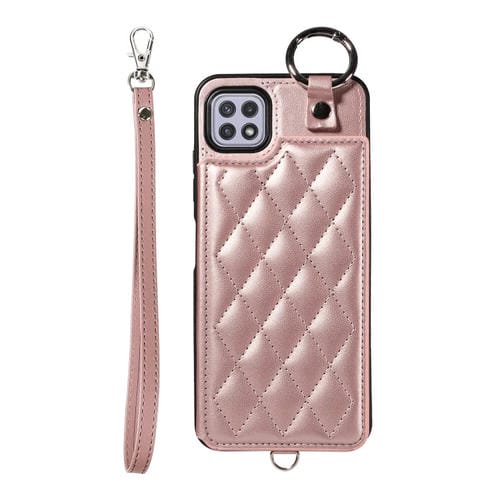 Estuche para Teléfono Samsung Galaxy A22 5G con Bolsa para Tarjetas Textura Rómbica y Cordón Corto (Oro Rosa)