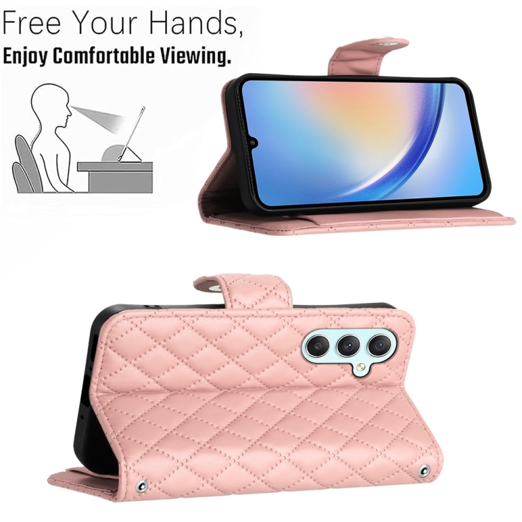 Funda para Teléfono Samsung Galaxy A34 con Tapa de Cuero Textura Rómbica y Cordón (Rosa Coral)