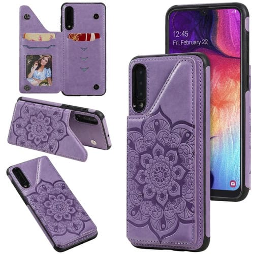 Estuche Protector Samsung Galaxy A50 Flor Patrón Grabado En Relieve a Prueba de Golpes con Soporte y Ranuras para Tarjetas (Púrpura)