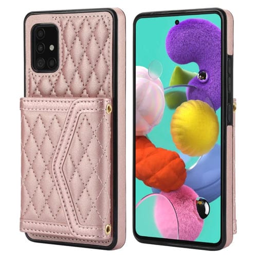 Estuche para Teléfono Samsung Galaxy A51 5G con Bolsa para Tarjetas Textura Rómbica y Cordón Largo (Oro Rosa)