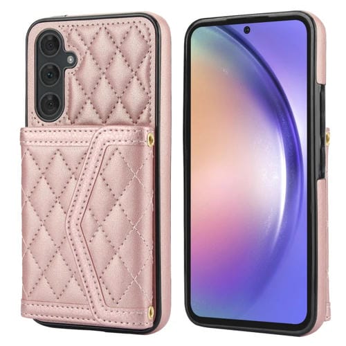 Estuche para Teléfono Samsung Galaxy A54 4G / 5G con Bolsa para Tarjetas Textura Rómbica Empalme Cordón Largo (Oro Rosa)