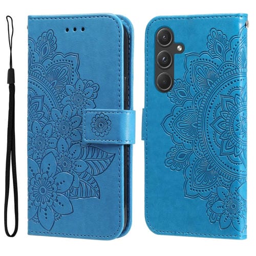 Funda de Cuero Samsung Galaxy A55 Estampado Flores 7 Pétalos (Azul)