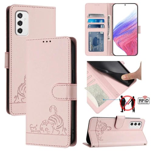 Estuche para teléfono Samsung Galaxy M52 5G Cat Rat cuero Rfid patrón en relieve con cordón (Rosa)