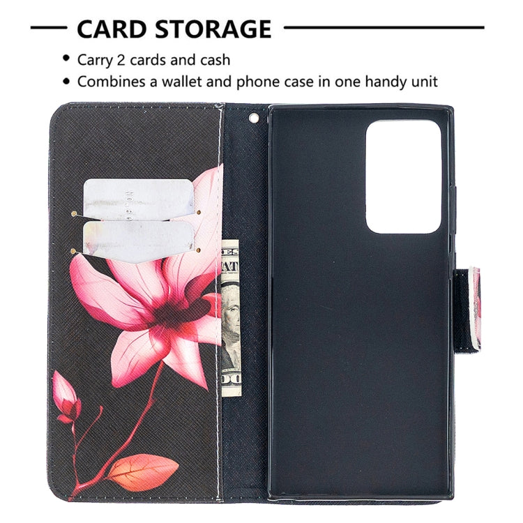 Estuche de Cuero Samsung Galaxy Note20 con Tapa Horizontal, Patrón de Dibujo Ultra Coloreado, Soporte, Ranuras para Tarjetas y Billetera (Lotus)