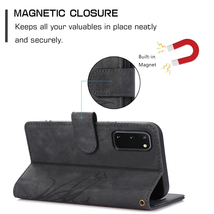 Funda de Cuero Samsung Galaxy S20 con Relieve Mariposa Orquídea (Negro)