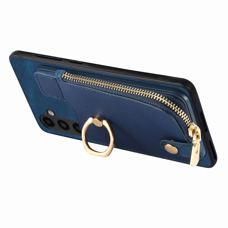 Funda para Teléfono Samsung Galaxy S21 FE 5G con Anillo de Cuero Cruzado Cremallera Vertical y Billetera Trasera (Azul)