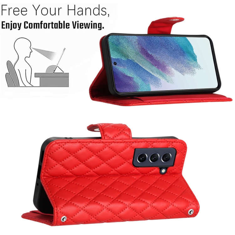 Funda para Teléfono Samsung Galaxy S21 FE 5G con Tapa de Cuero Textura Romboidal y Cordón Largo (Rojo)