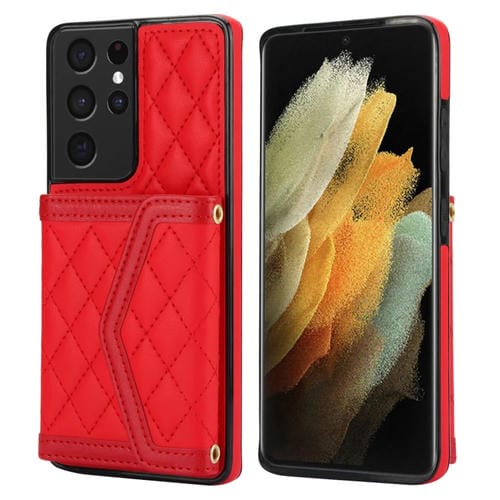 Estuche para teléfono Samsung Galaxy S21 Ultra 5G con bolsa para tarjetas textura rómbica y cordón largo (Rojo)