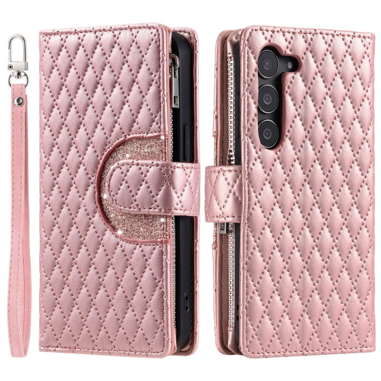 Estuche de Cuero para Samsung Galaxy S23 + 5G con Billetera, Cremallera y Celosía con Purpurina (Oro Rosa)