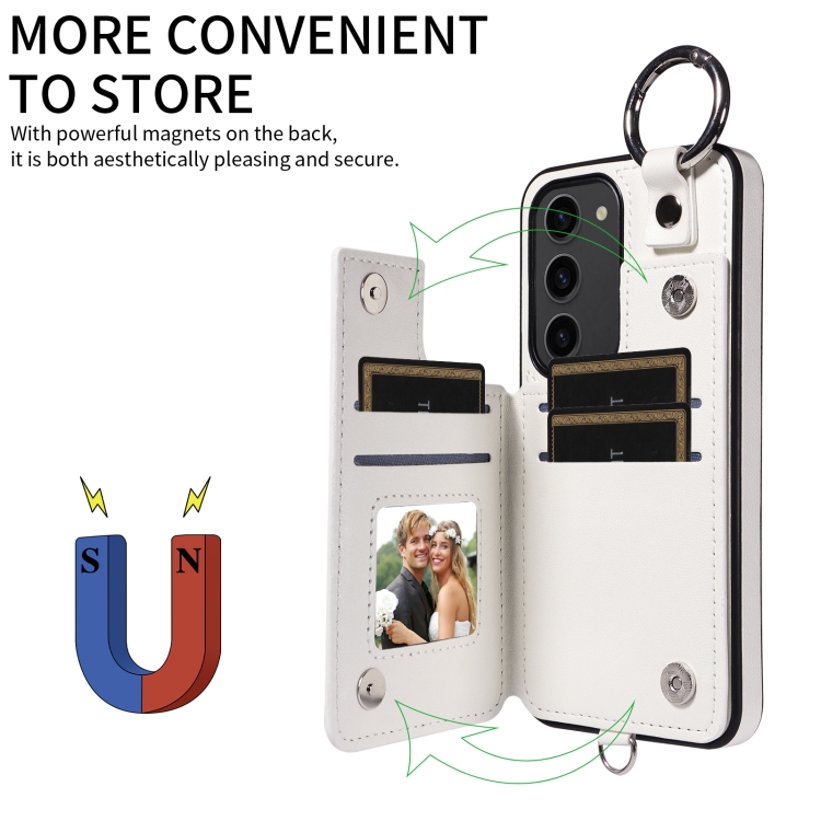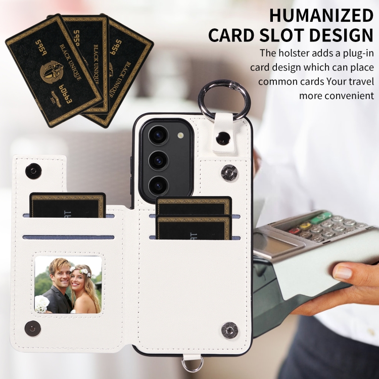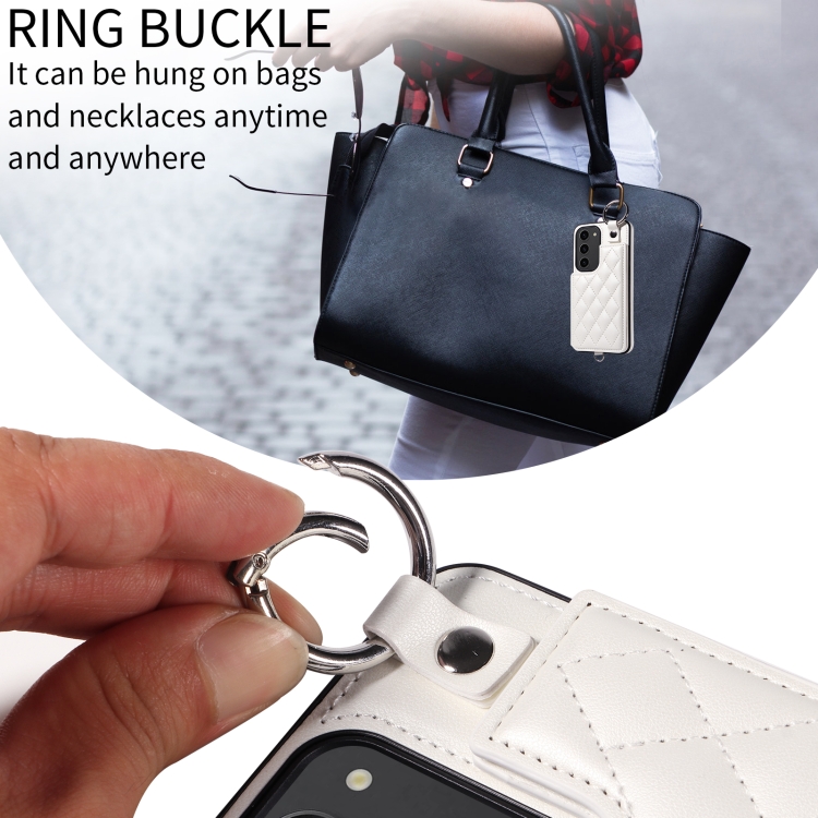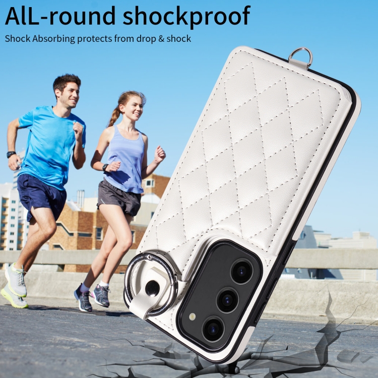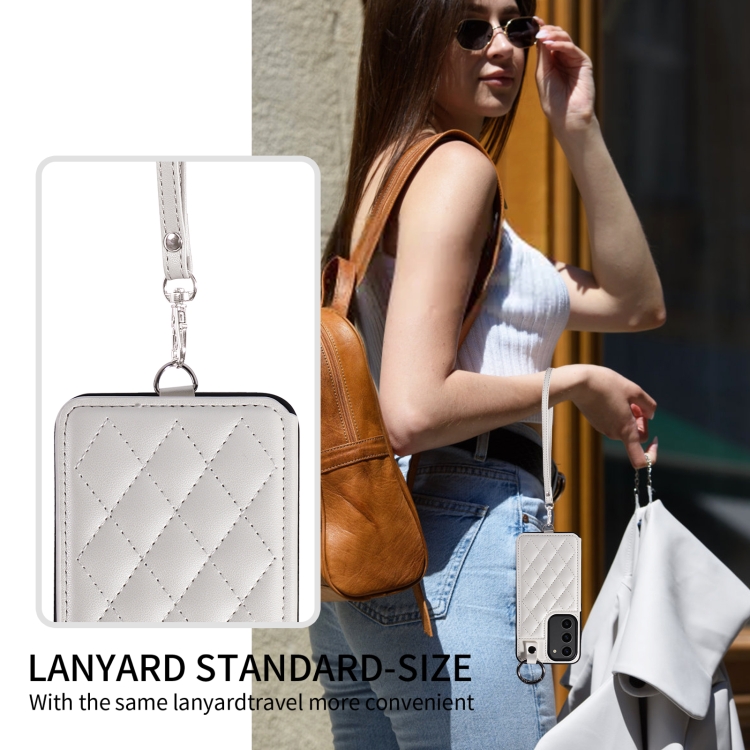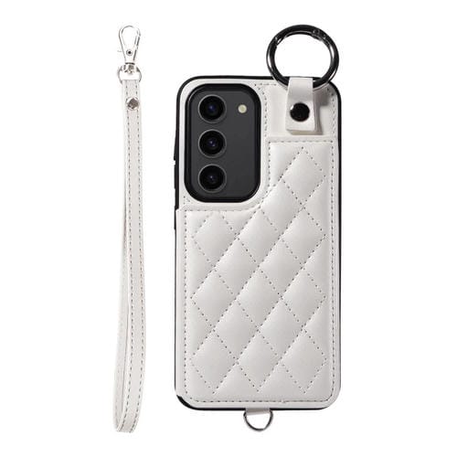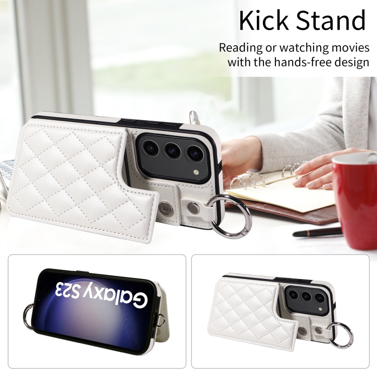 Estuche para Teléfono Samsung Galaxy S23 5G con Bolsa para Tarjetas Textura Rómbica y Cordón Corto (Blanco)