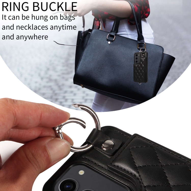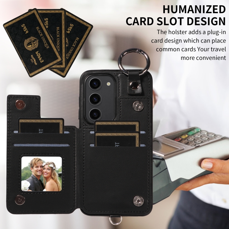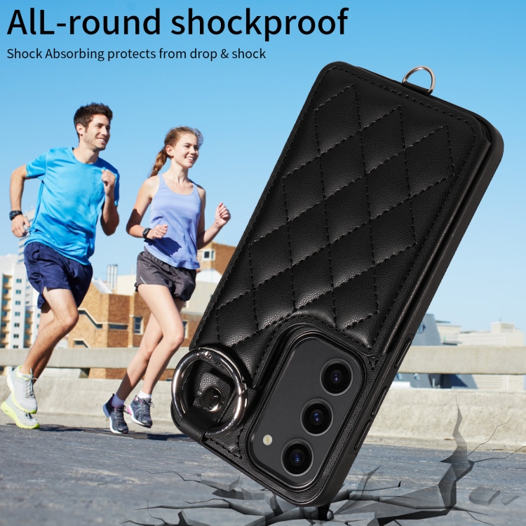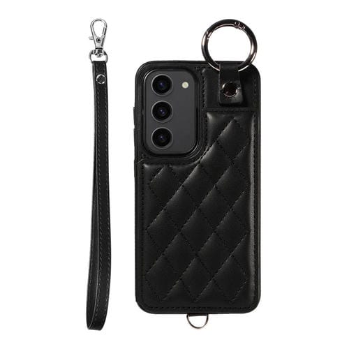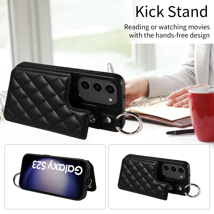 Estuche para Teléfono Samsung Galaxy S23 5G con Bolsa para Tarjetas Textura Rómbica y Cordón Corto (Negro)