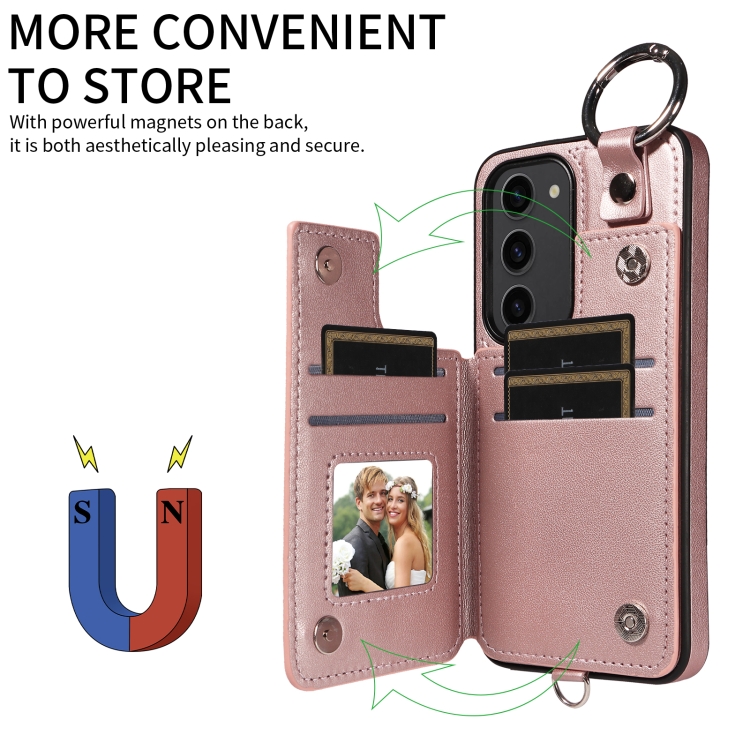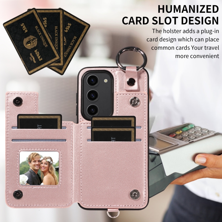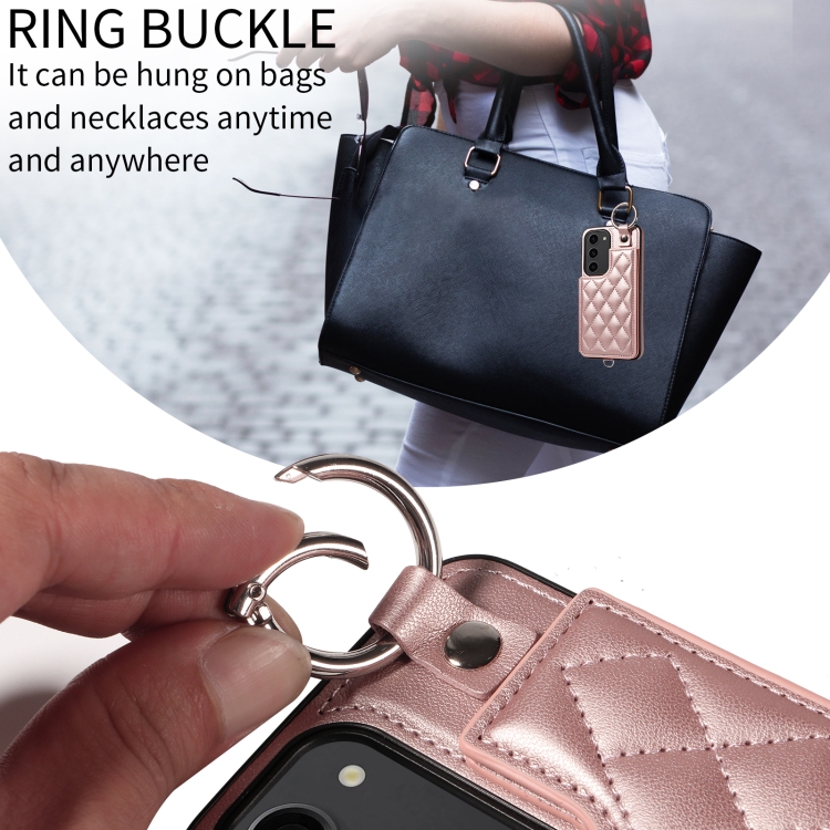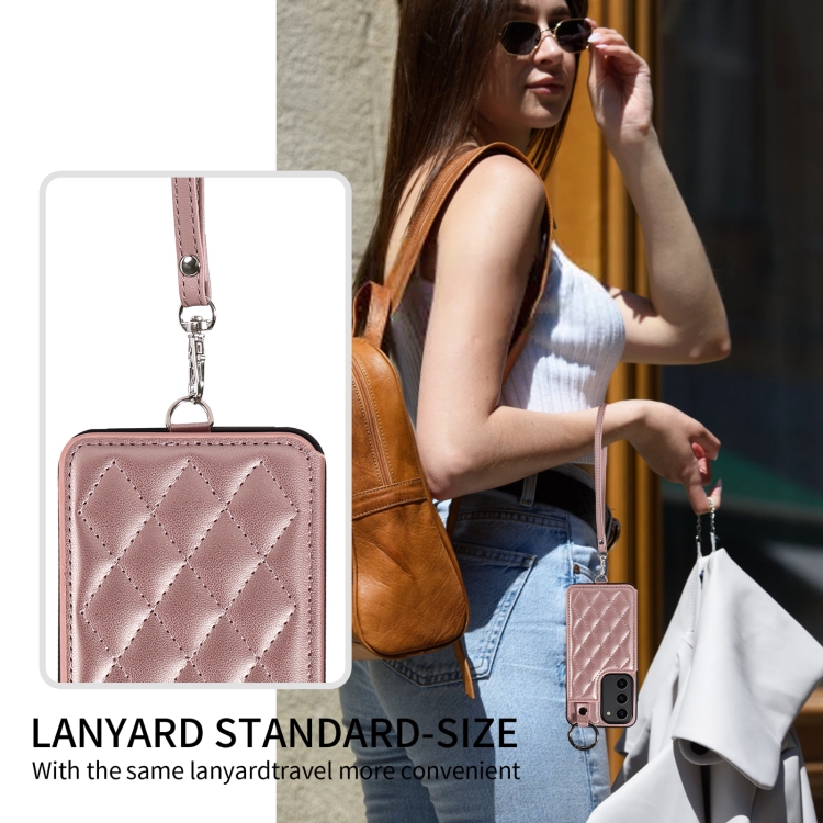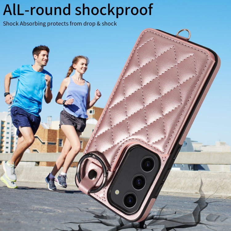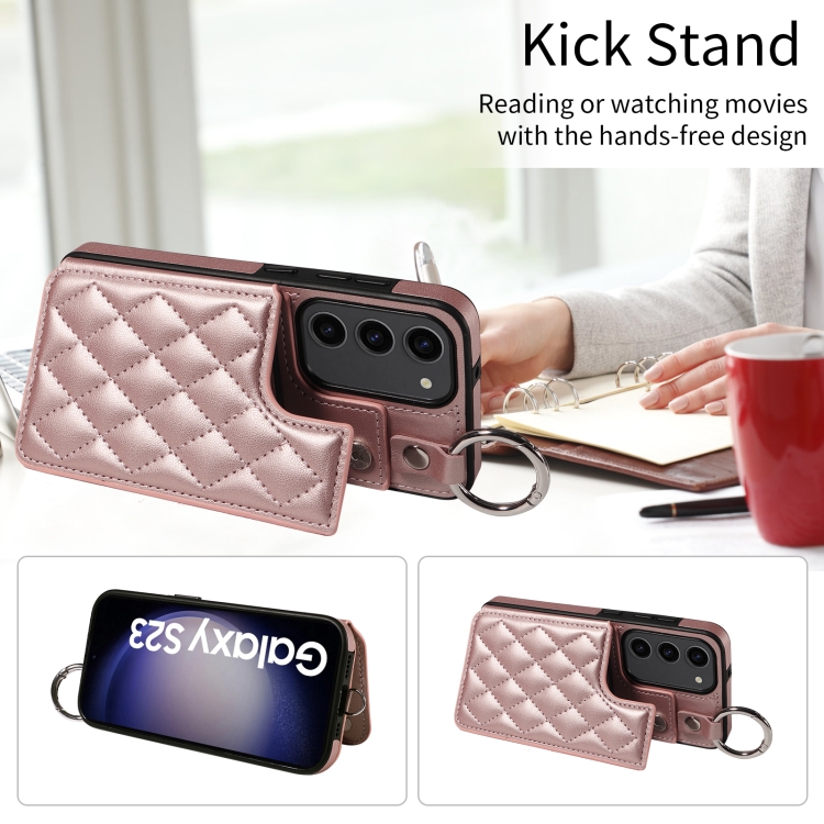 Estuche para Teléfono Samsung Galaxy S23 5G con Bolsa para Tarjetas Textura Rómbica y Cordón Corto (Oro Rosa)