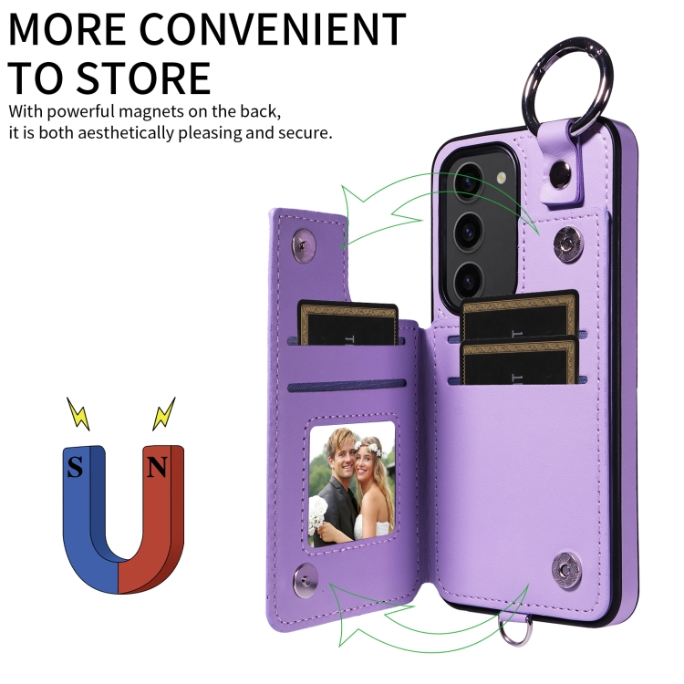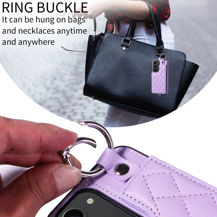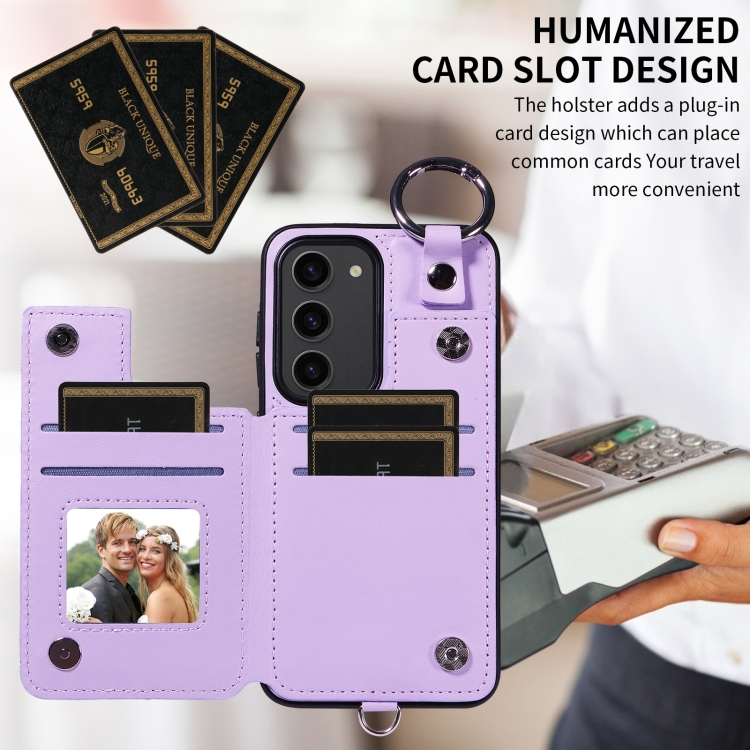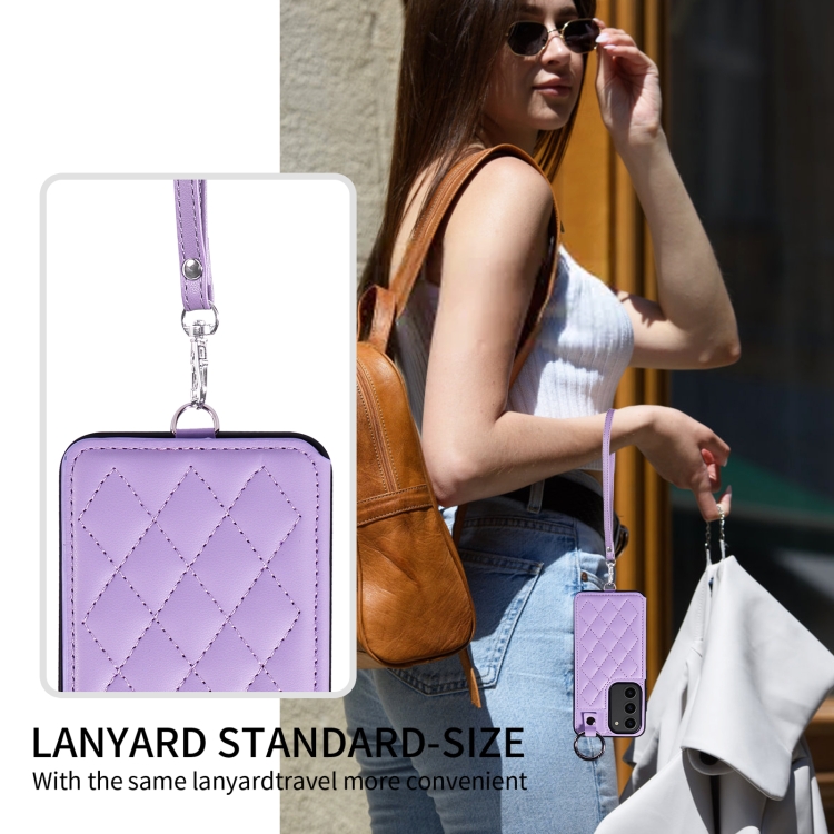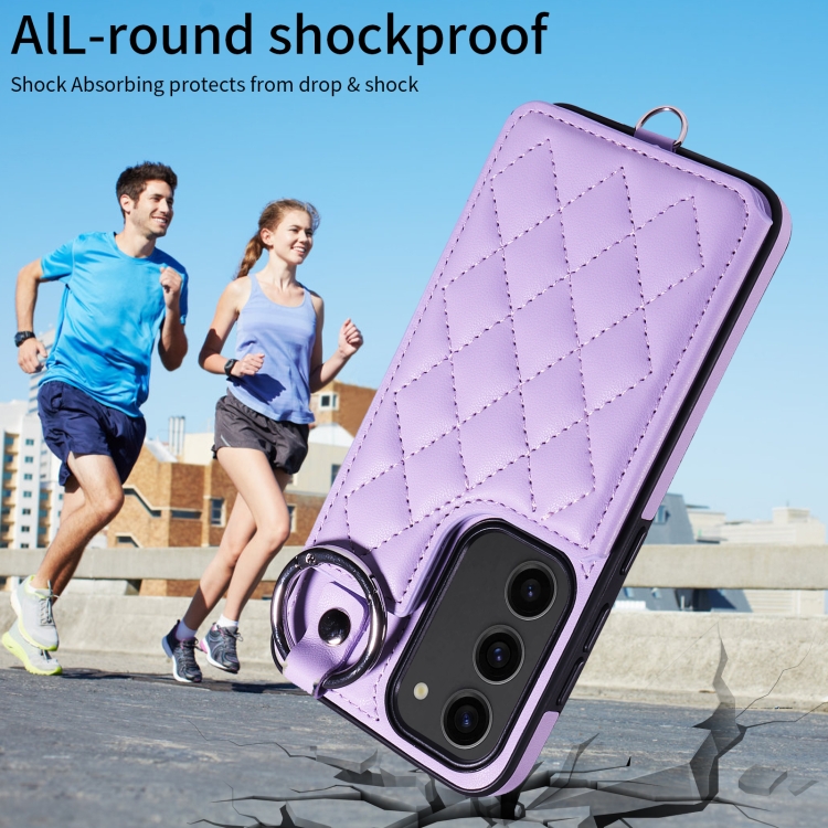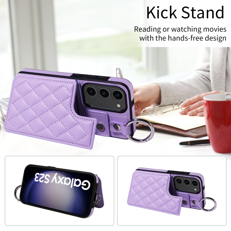 Estuche para Teléfono Samsung Galaxy S23 5G con Bolsa para Tarjetas Textura Rómbica y Cordón Corto (Púrpura)