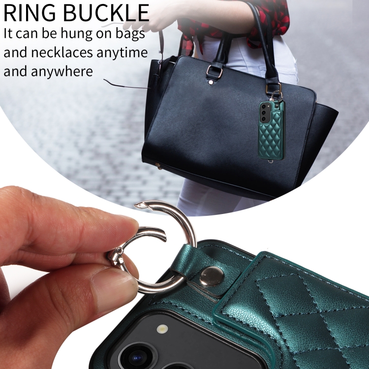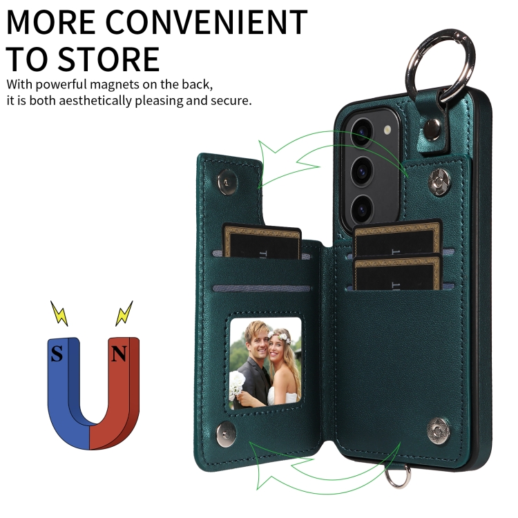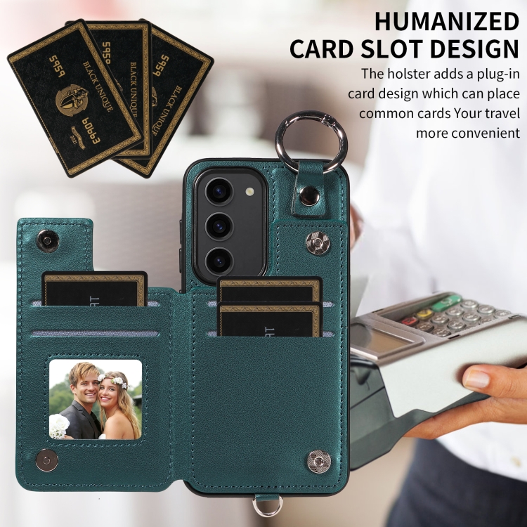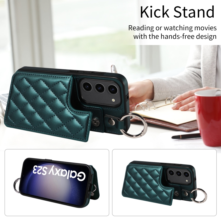 Estuche para Teléfono Samsung Galaxy S23 5G con Bolsa para Tarjetas Textura Rómbica y Cordón Corto (Verde)