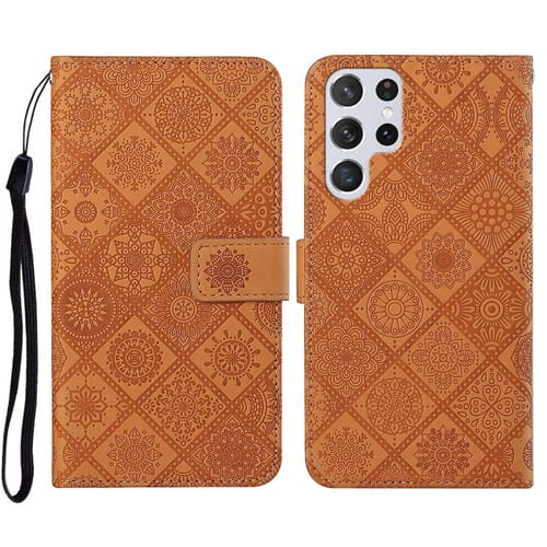 Estuche para Teléfono Samsung Galaxy S23 Ultra 5G Cuero Patrón En Relieve Estilo Étnico (Marrón)