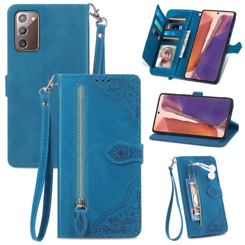 Funda de Cuero Samsung Galaxy S24 + 5G con Cremallera y Flores en Relieve (Azul)