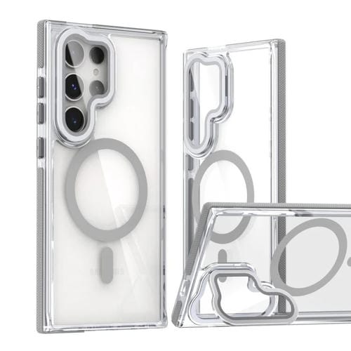 Estuche para Teléfono Samsung Galaxy S24 Ultra 5G Híbrido Acrílico Transparente Doble Color con Película de Lente y Soporte (Gris)