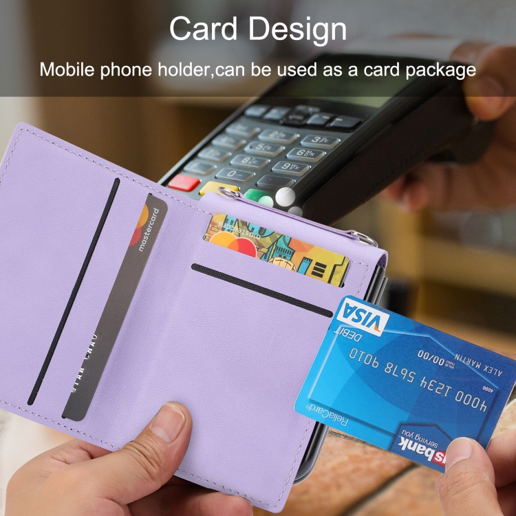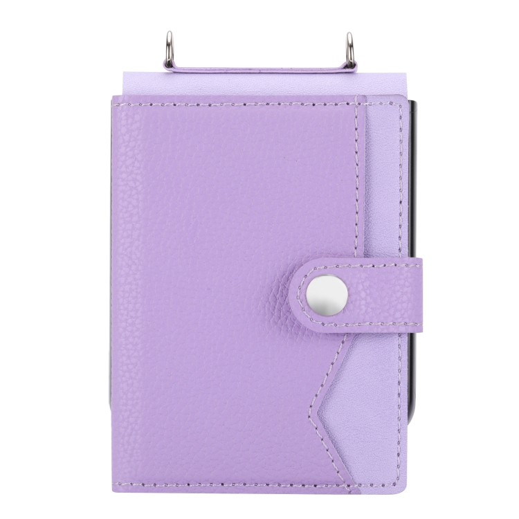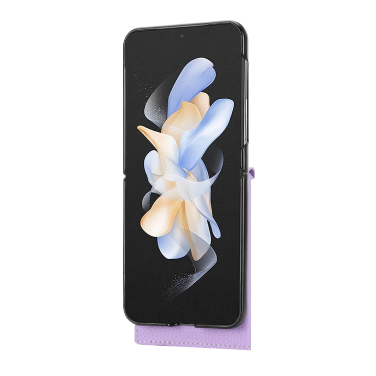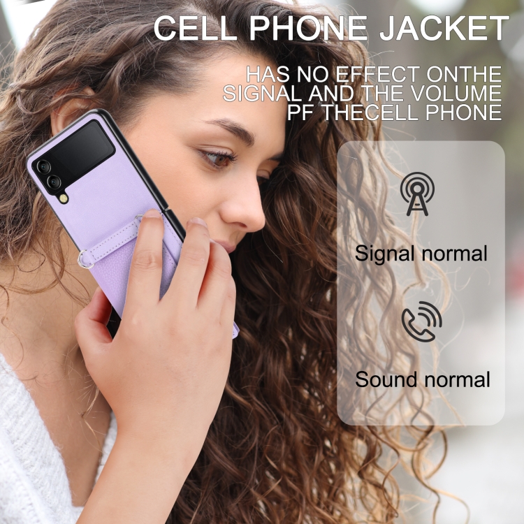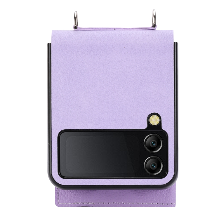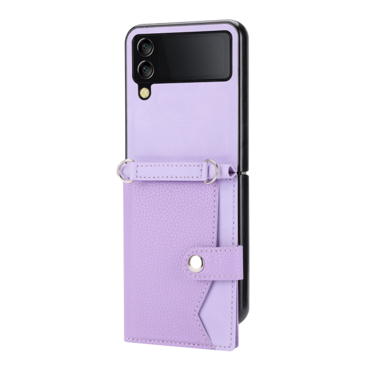 Funda para Samsung Galaxy Z Flip3 5G con Tarjetero de Un Solo Botón Patrón Litchi y Cordón Largo (Púrpura Claro)