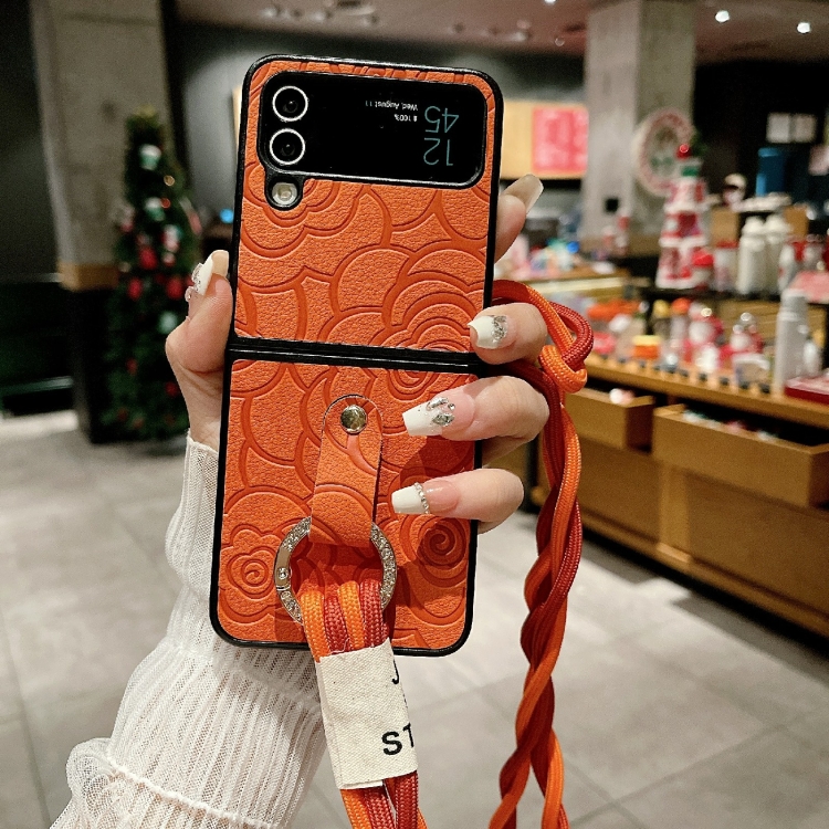 Funda Protectora Samsung Galaxy Z Flip3 5G con Patrón de Camelia, Cordón Largo y Anillo de Diamante (Naranja)