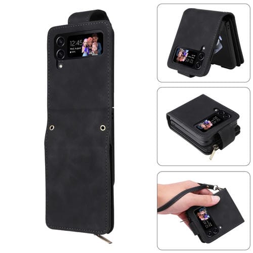 Estuche para Teléfono Samsung Galaxy Z Flip4 Cuero con Billetera y Cremallera Esmerilada Multifuncional (Negro)