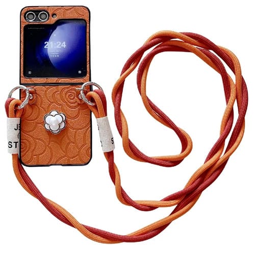 Funda Protectora Samsung Galaxy Z Flip5 5G Impression Camellia Pattern con Cordón Largo (Naranja)