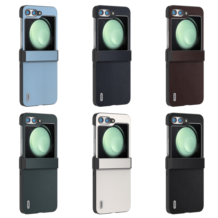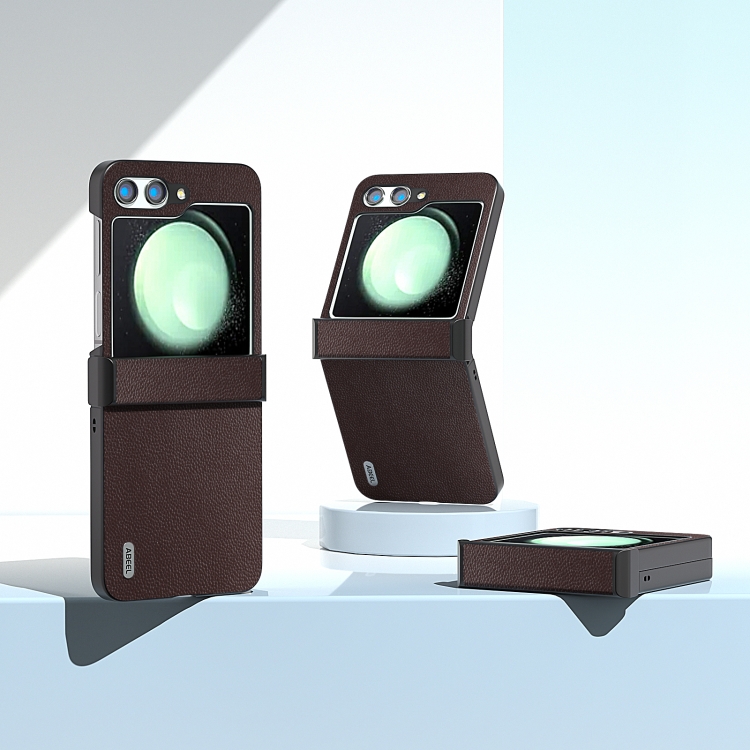 Funda para Samsung Galaxy Z Flip5 Abeel con Borde Negro de Cuero Genuino de Tres Etapas (Café)