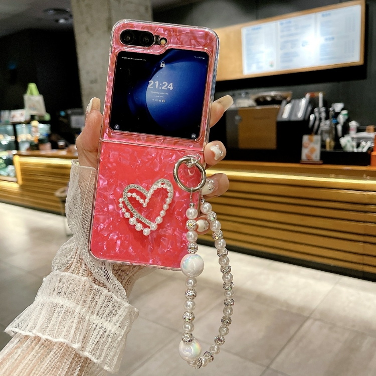 Estuche para teléfono Samsung Galaxy Z Flip5 patrón corazón textura concha nacarada pulsera (Rojo)