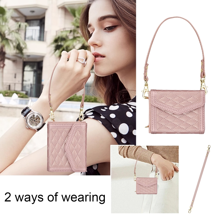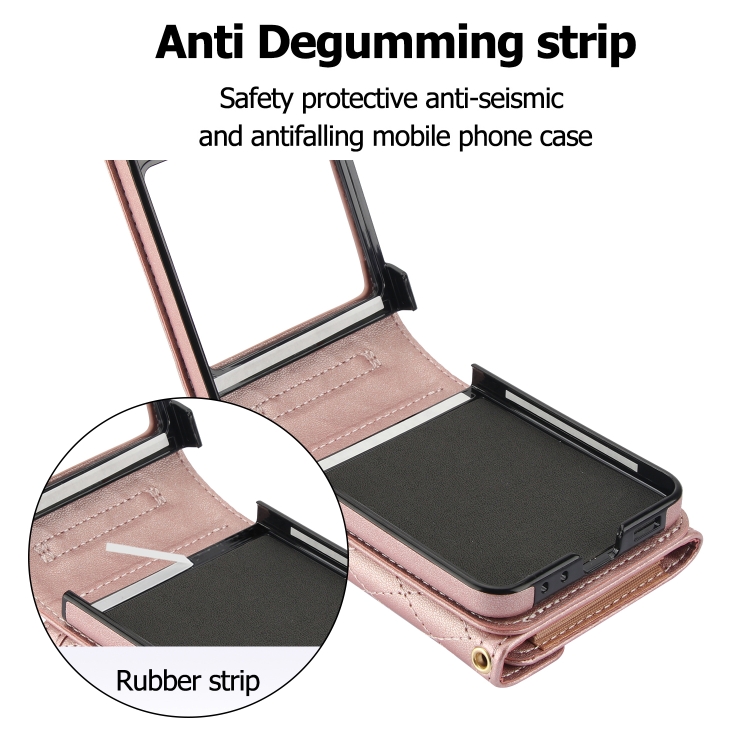 Estuche para Teléfono Samsung Galaxy Z Flip5 Textura Rómbica Empalmada con Cordón Largo y Corto (Oro Rosa)