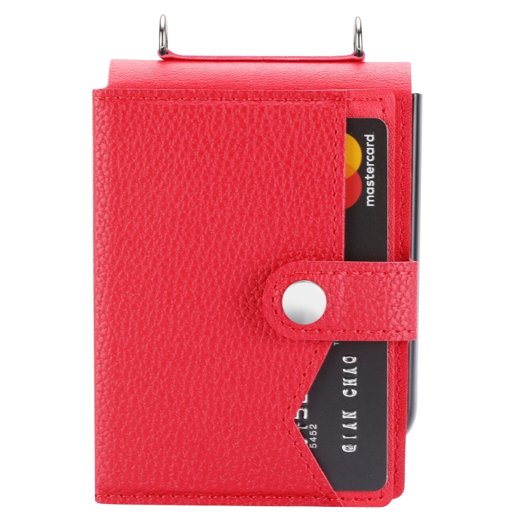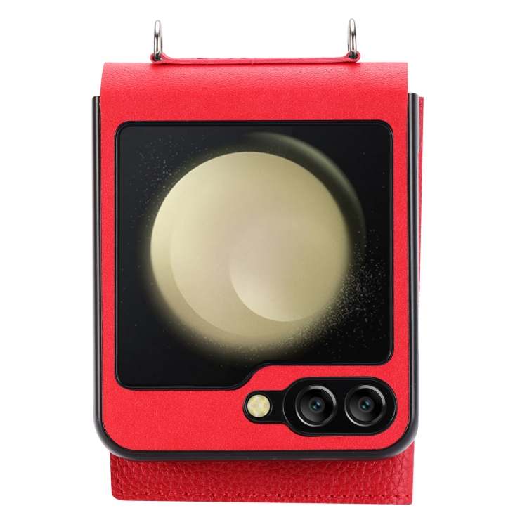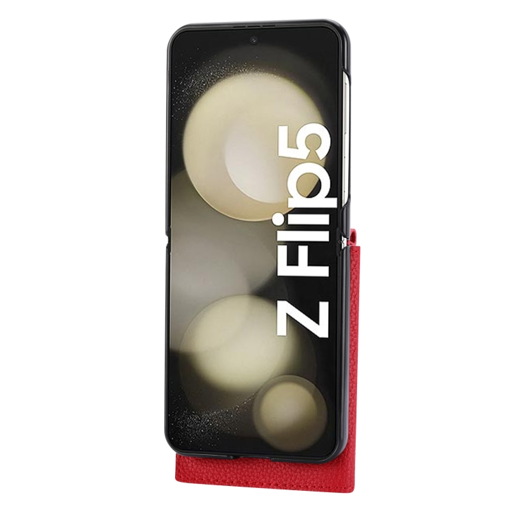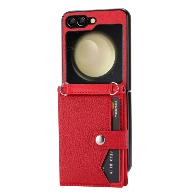 Funda para teléfono Samsung Galaxy Z Flip5 Litchi Pattern con tarjetero y cordón largo (Rojo)