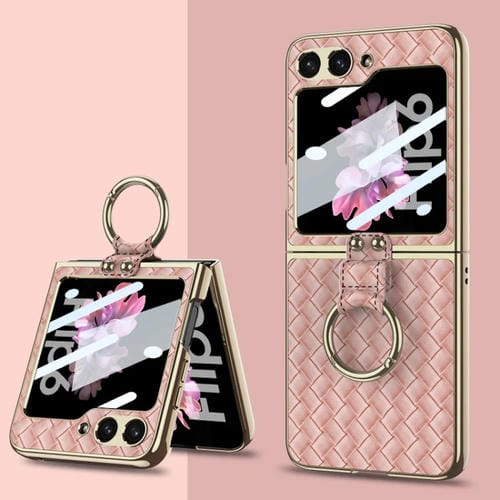 Estuche para teléfono Samsung Galaxy Z Flip6 Gkk con textura de tejido y soporte para anillo (Rosa)