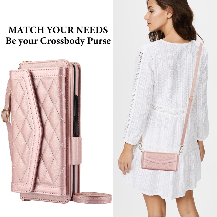 Estuche para Teléfono Samsung Galaxy Z Fold3 5G con Tarjetero Textura Rómbica y Empalme con Cordón (Oro Rosa)