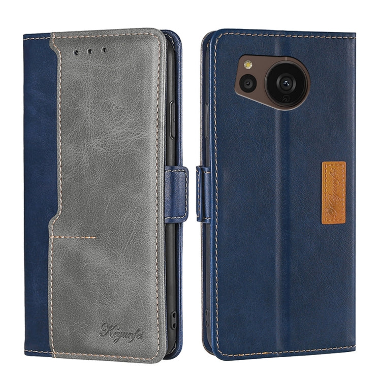 Funda de Cuero para Sharp Aquos Sense7 Plus con Hebilla Lateral y Contraste de Color (Azul + Gris)