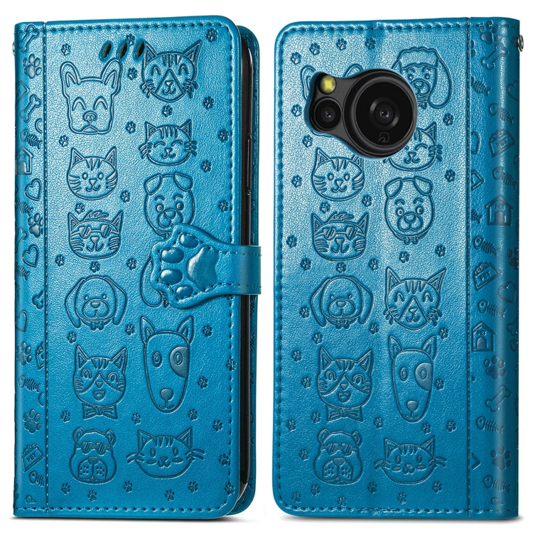 Funda para Sharp Aquos Sense8 de Cuero con Relieve de Perros y Gatos (Azul)